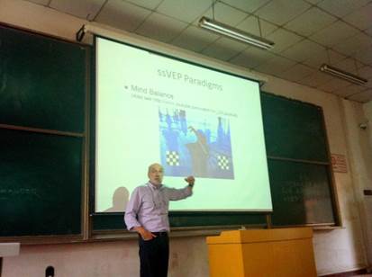 两次课程紧切“认知科学与工程”的关键内容。第一堂课的主题为“Principles of Brain Machine Interface(BMI)”。Principe教授首先介绍了BMI的特点和BMI面临的技术问题,接着介绍了他的团队研发的一套BMI系统:Florida Wireless Implantable Recording Electrodes(FWIRE)。这套系统具有低功耗、无线传输、便携等特点,可以装在小鼠的大脑上,完成实时的脑机交互。Principe教授还向同学们讲解了该系统所采用的算法模型,并用简洁明了的语言使同学们明白如何将一个未知的复杂的系统分解简化,然后采用我们熟知的简单的模型对其进行描述,进而解决一个实际的工程问题。第二堂课的主题为“Models and Physiology of Macroscopic Brain Activity”。Principe教授介绍了大脑活动的宏观模型,并向同学们讲解了EEG的原理以及在BCI中的应用。