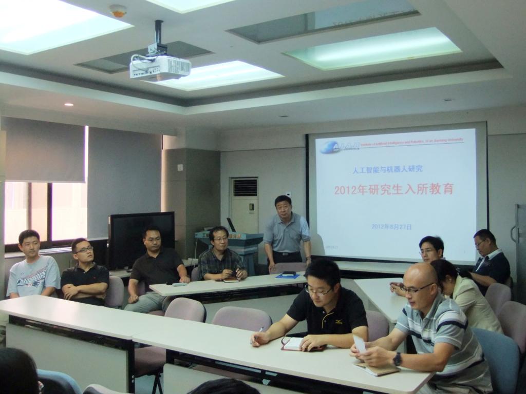 2012年8月27日,人工智能与机器人研究所全体老师以及2011级全体研究生参加了在所内大会议室举办的入所教育大会,本次会议由刘跃虎老师主持,对新进入人机所进行研究工作的同学们介绍了人机所概况以及相关文化,并进行了入所教育。
