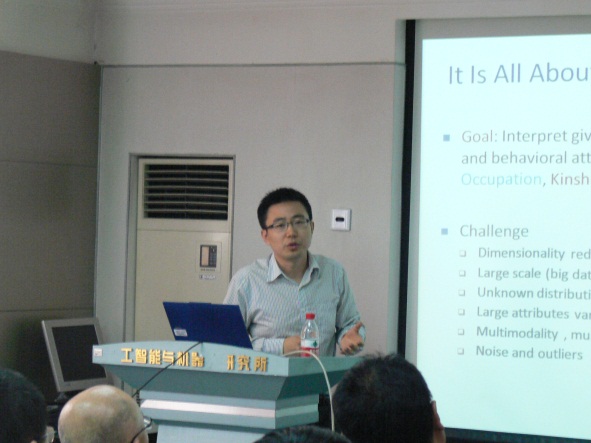 付昀教授以视频图像序列降维处理简要介绍作为学术报告的开端,随即介绍目前团队研究根据人脸识别心情,在做了大量的数据统计后,不高兴和平常心情的区分度不是很大,他认为这是因为人所有的社会属性使得不高兴心情被隐藏。随后付昀博士依次介绍了亲属识别,年龄识别和根据嘴型识别语音,整个报告图文并茂,演示视频精彩,让前来聆听报告的师生们生动形象的了解了这一领域的知识。