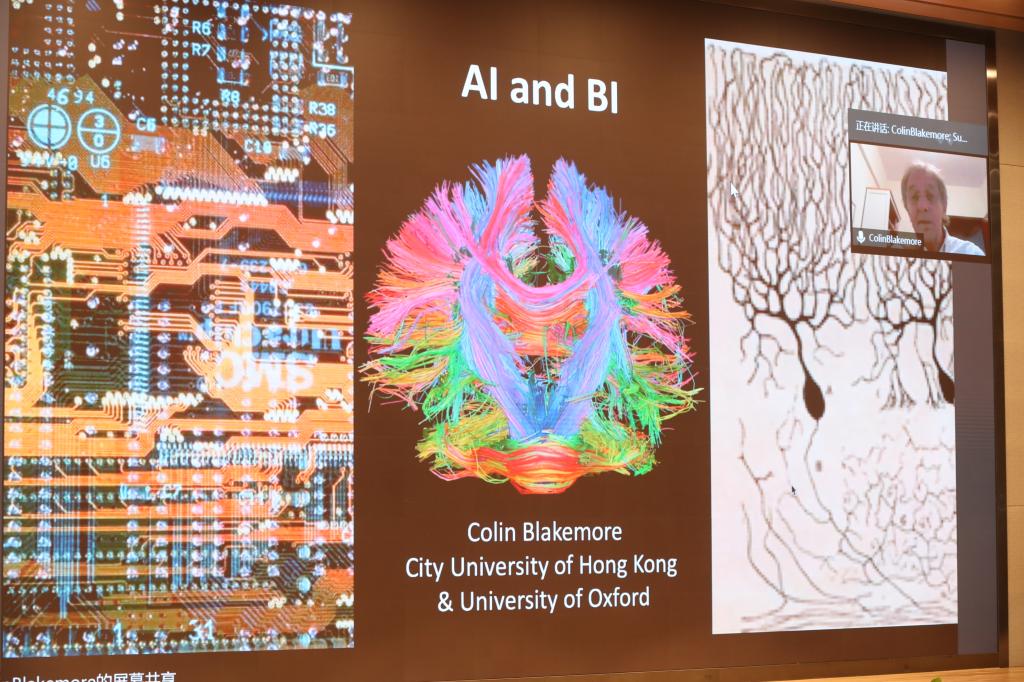 为了让同学们能够更好地共享学术盛宴,下半场讲座现场远程连线身在香港的Colin Blakemore教授,Blakemore教授讲座的主题是“人工智能与大脑智能(Artificial Intelligence and Brain Intelligence)”。报告首先介绍了大脑智能研究的重要性,以图灵测试引出了机器智能和大脑智能。Blakemore教授以非常专业和详细的视角阐释了大脑功能局部性、脑可塑性、进化对大脑的影响,神经元与突触和神经脉冲编码等知识。中间穿插了小鼠等实验例子以及各种神经元结构动画,生动形象的解释了原本晦涩难懂的专业知识。Blakemore教授表示目前在中国随处可见的“大脑启发型人工智能”的口号表达了一种希望,即大脑可能掌握神经计算的其他秘密,这些秘密可以在未来几代人工智能中复制。这也许是真的,但重要的是要明白,我们对大脑方面的知识仍然是非常基础的,而且大脑计算的概率性、模拟性在许多方面与机器计算的原理根本不同。事实上,相比于大脑研究告诉我们的人工智能,人工智能的发展有可能更多地告诉我们大脑是如何工作的。