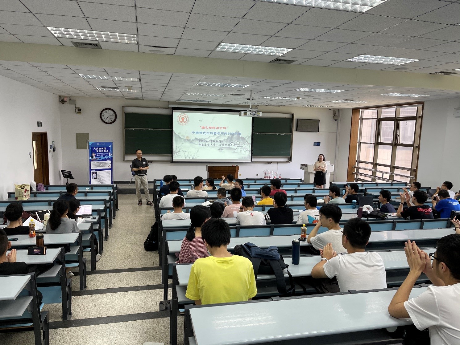 2019、2020两届全体本科生百余名同学欢聚一堂,琴瑟齐鸣,这里正在举办一场别开生面的音乐赏析讲座。