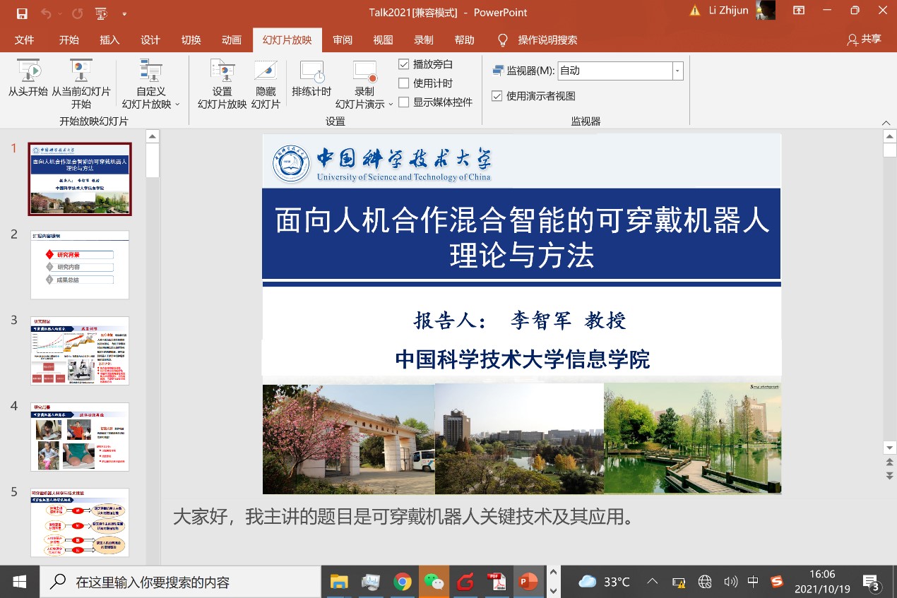 李智军教授介绍了面向人机合作混合智能的可穿戴机器人理论与方法,从感、知、融、控多个方面介绍了课题组在可穿戴机器人领域的研究进展,部分成果已在临床获得应用。