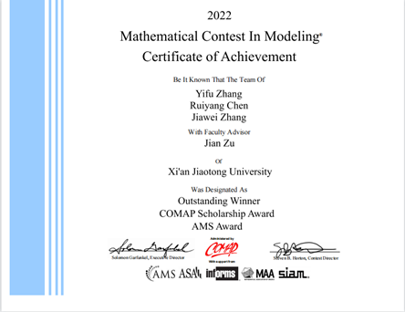 的参赛学子们在本次比赛中斩获佳绩,获美国数学及其应用联合会学术奖(COMAP Scholarship Award)。全球仅有来自哥伦比亚大学、纽约大学、大连理工大学以及西安交通大学的4只参赛队伍荣获该奖项,这也是交大学子连续五年获得最高奖。